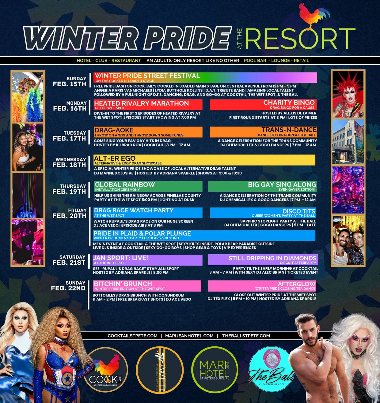 Winter Pride Saint Pete will also host the Global Rainbow: We Rise in Light Launch Gathering on Thursday, Feb. 19, beginning at 5 p.m., with the official lighting of the lasers taking place at dusk. The public is invited to gather in front of the Mari Jean Hotel, 2349 Central Ave., St. Petersburg above COCKtail, as the city is illuminated in light, color, and pride.